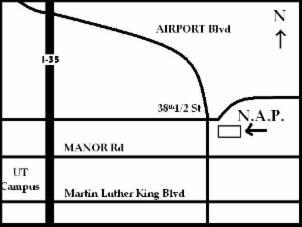 Driving South on Airport Blvd, turn left on 381/2 St. (the first street after the Mueller development site) and turn right into the complex immediately after the Shell Gas station.